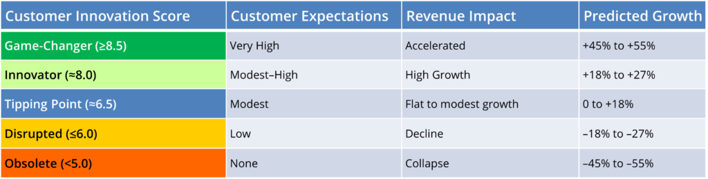 Your Customer Innovation Score is a single metric providing strategic insight into customer’s innovation expectations and your company’s future revenue.