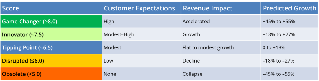 Repeat steps 1 to 3 to keep pace with opportunities. Algorithms score and rank customer responses across 4 score range bands to predict the impact of this on your revenue in the next 12-18 months. The lowest scores are in Range Band 4 (<5) and at the opposite end of the spectrum, Range Band 1 is home to the highest scores (>8), where customers have strong expectations of your company’s ability to meet their changing needs.